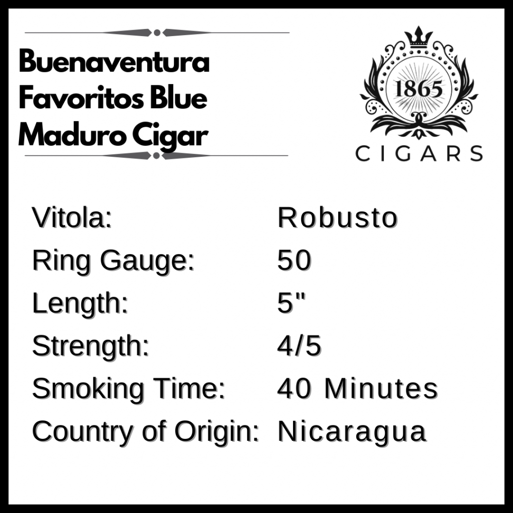 The Buenaventura Favoritos Blue Robusto cigar has a complex and well-balanced profile with notes of chocolate, spice, roasted nuts, leather and cedar with a hint of sweetness on the finish.