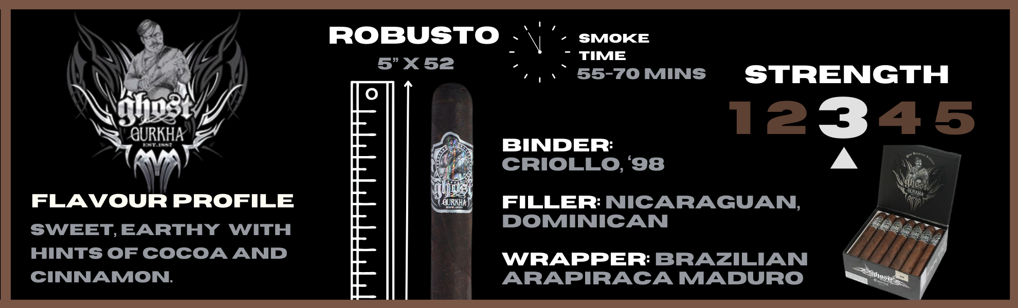 The Ghost Blend showcases a dark Brazilian, Arapiraca Maduro wrapper, complemented by an aged Criollo 1998 binder and carefully selected Dominican and Nicaraguan Fillers. Ghost is a rich, medium-bodied cigar with a multi-layered flavour profile providing sweet and earthy undertones with lingering Flavours of Cocoa and Cinnamon.