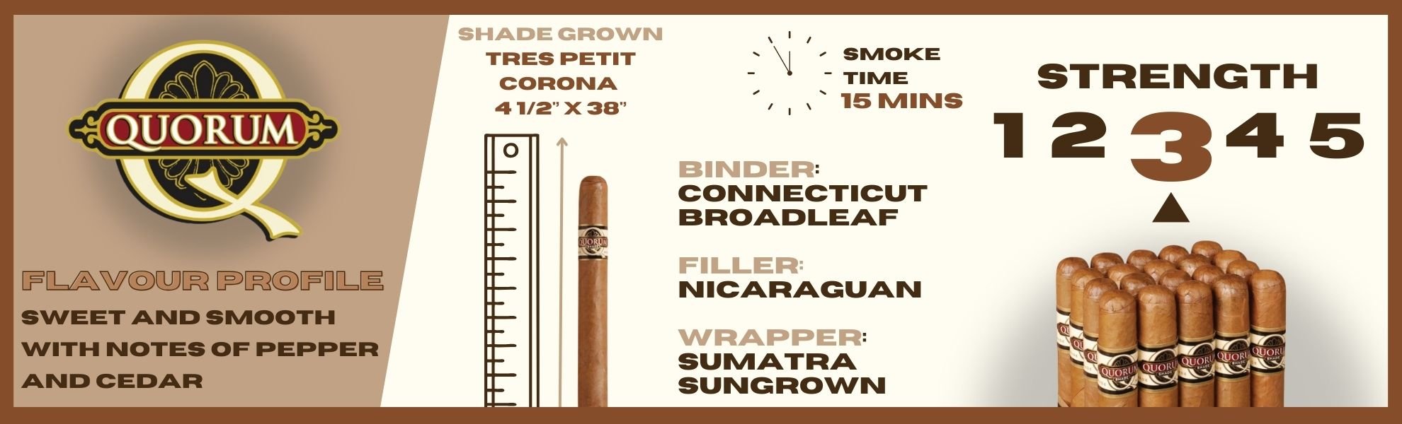 Filled with spicy Nicaraguan long filler and paired with a special Ecuadorian wrapper leaf, Quorum smokers can enjoy a delightfully nutty, smooth flavour at a great price.